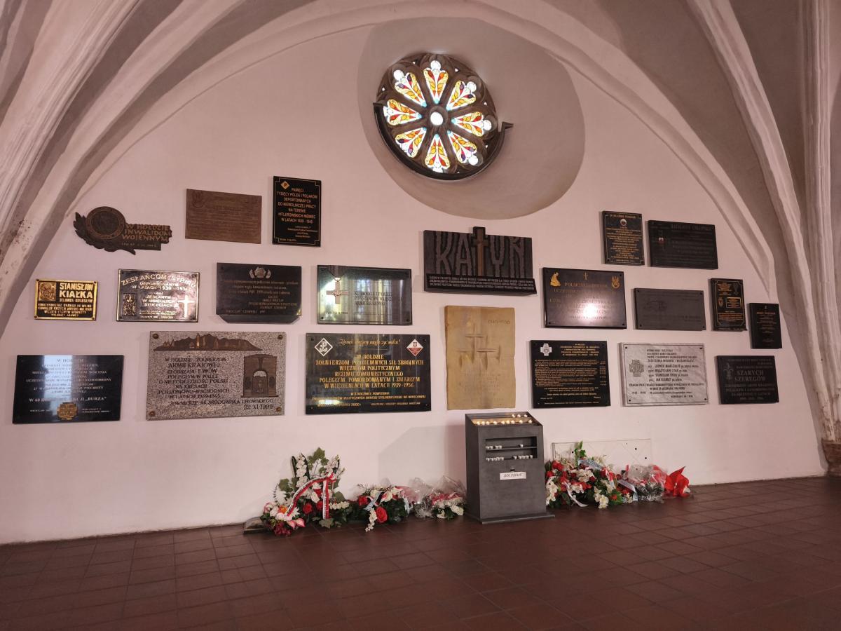 Na ścianach bazyliki znajdują się liczne upamiętnienia związane z historią Wojska Polskiego (to jest kościół garnizonowy) AK i środowiskami kombatanckimi. Jedna z najważniejszych to tablica poświęcona Aleksander Krzyżanowski „Wilkowi”, komendantowi Okręgu Wileńskiego Armii Krajowej. Wmurowana w 1997 roku, upamiętnia jego i jego żołnierzy.