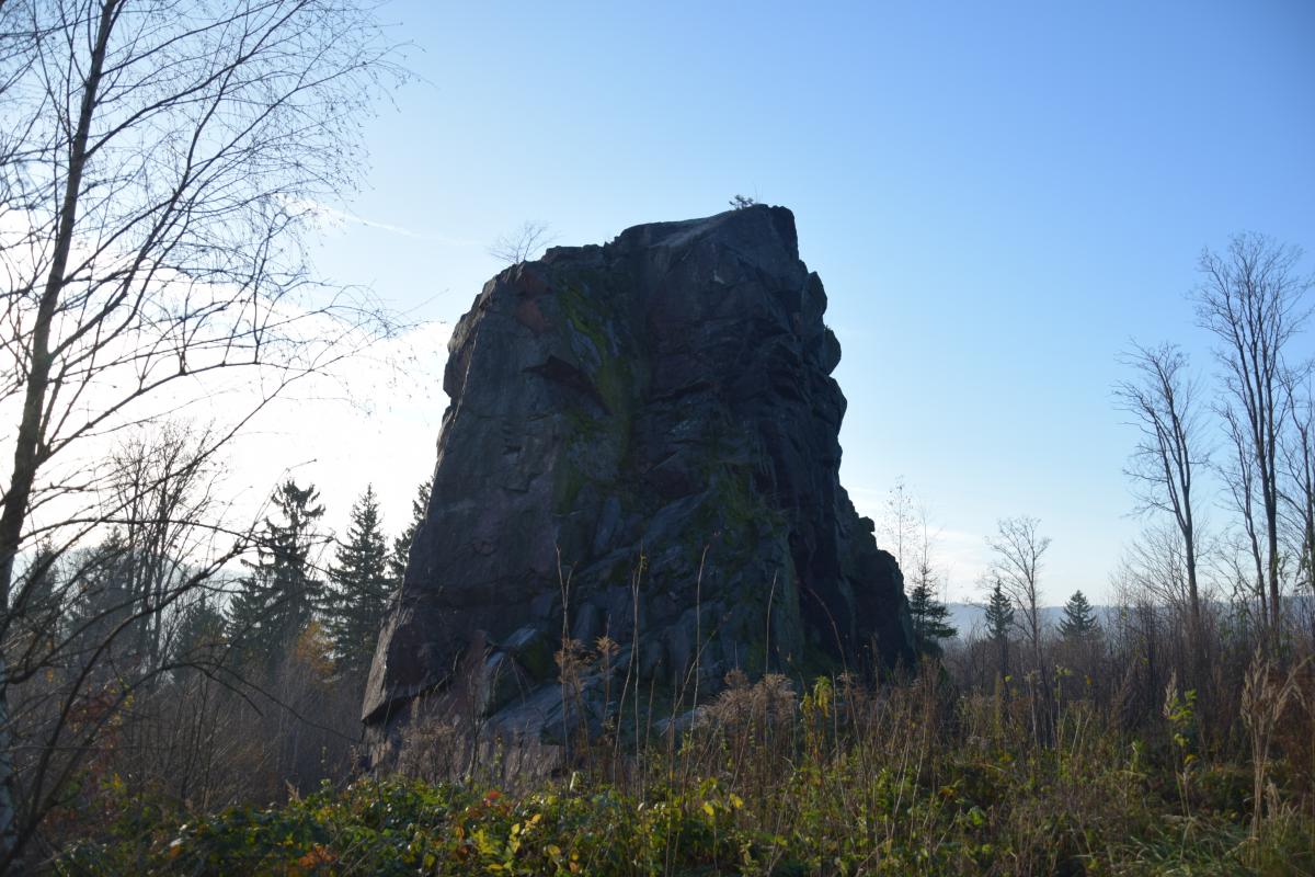 Czerwona Skała jest jednym z geostanowisk Krainy Wygasłych Wulkanów, a jej geneza sięga czasów, gdy w tym regionie wrzało, dymiło i kipiało magmą. Tworzące ją trachity to skały kwasowe, twarde jak diabli, odporne na wietrzenie i charakterystyczne dla dawnych kominów wulkanicznych. Nic dziwnego, że przetrwały miliony lat, podczas gdy otaczające je skały osadowe dawno wytarła erozja. Efekt? Pionowy mur skalny, który od jednej strony wznosi się na około osiem metrów, a od drugiej potrafi sięgać nawet dwunastu. Przed wojną Niemcy uznawali to miejsce za pomnik przyrody. Nie bez powodu.