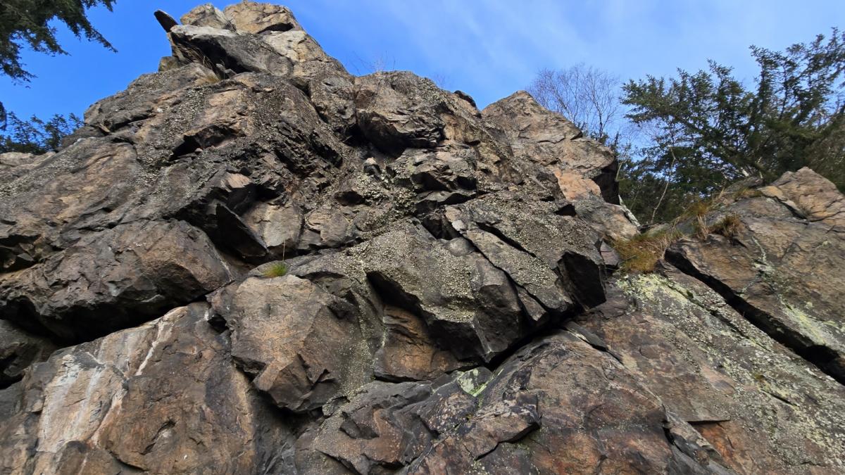 Właśnie ta budowa sprawia, że keratofir łamie się ostro, w pionowe, często niemal geometryczne bloki. To dzięki temu Diablak wygląda bardziej „górsko”, niż mógłby sugerować jego pogórski kontekst. Charakterystyczny kolor – ciemny, brunatnoczerwony, miejscami z zielonkawymi nalotami – wynika z procesów przeobrażenia i utleniania, które przez miliony lat działały na jego powierzchnię. W terenie daje to efekt imponującej, poszarpanej ściany wyrastającej z lasu jak fragment skalnej baszty.