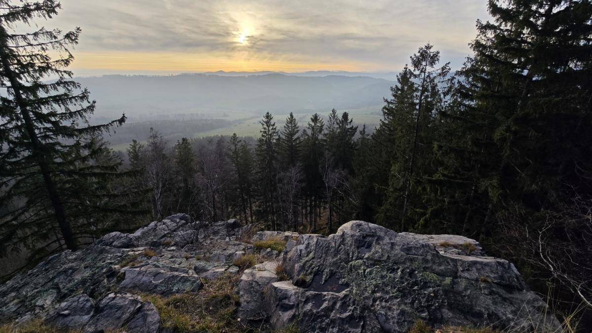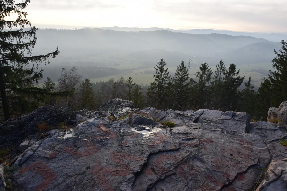 Widok z góry jest zaskakujący. W ogóle nie pasuje do stereotypu „niskich gór . Pierwszy plan to gęsty las, dalej łagodne fale Pogórza Kaczawskiego i dolin między Mysłowem a Kaczorowem i Janowicami. A na granicy widnokręgu wyraźnie rysuje się grzbiet Karkonoszy – daleki, rozmyty światłem, ale jednoznaczny dla każdego, kto zna te góry.