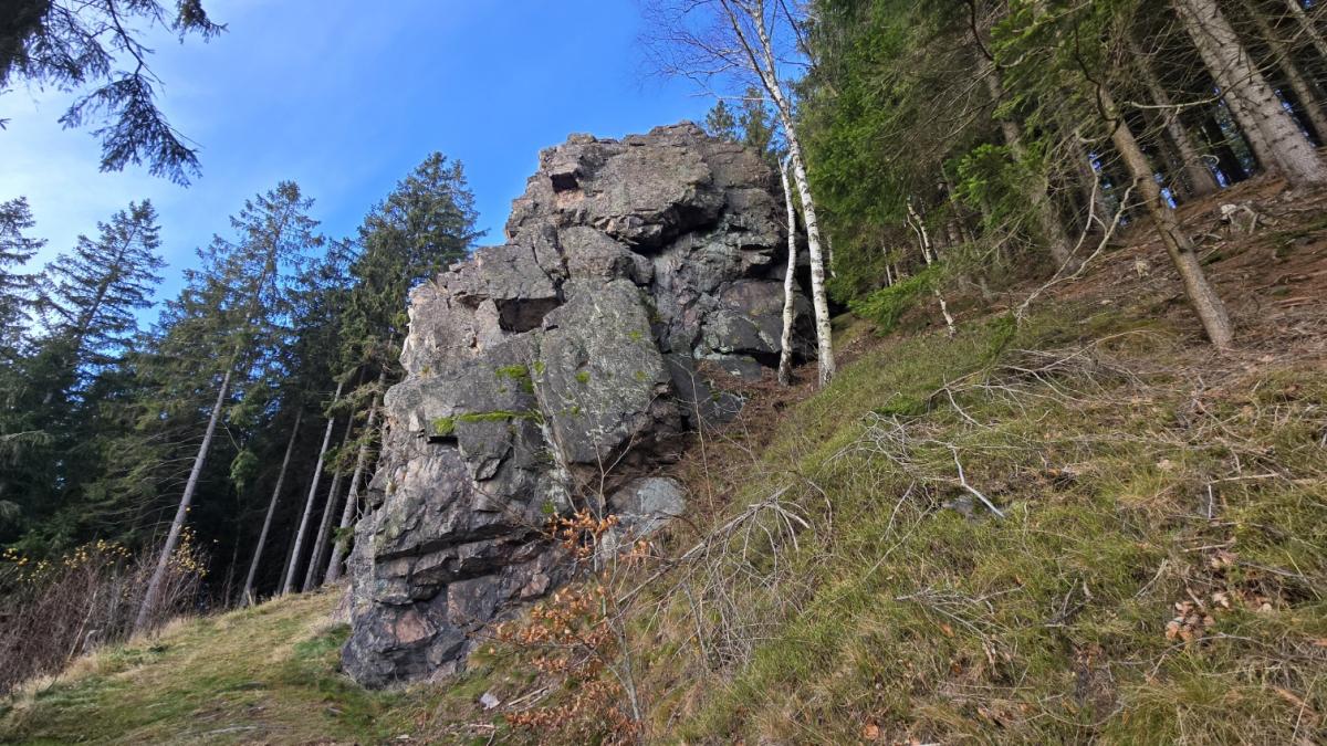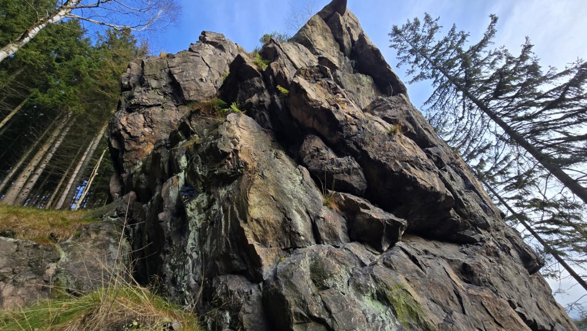 Nie jest to atrakcja dla każdego – stromizna i ekspozycja są realne, a skała bywa wilgotna i śliska. Wejście wymaga pewności ruchu i zachowania ostrożności; w złych warunkach lepiej odpuścić. Ale przy suchej pogodzie daje to namiastkę górskiej adrenaliny, jakiej na Pogórzu Kaczawskim raczej nie szukamy.