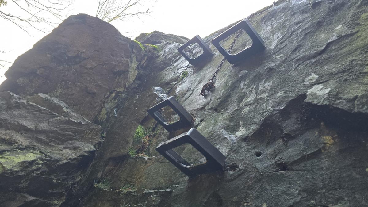 Podejście od żółtego szlaku nie zdradza jeszcze, że za chwilę zmieni się klimat całej wędrówki. Leśna ścieżka trawersuje stok, a potem – niemal bez ostrzeżenia – wyrasta przed nami kilkunastometrowa, poszarpana ściana. Dopiero po wejściu bliżej widać najciekawszy element: metalowe klamry i stopnie zamontowane na stronie odwróconej do lasu, w takim miejscu, że z głównej ścieżki są kompletnie niewidoczne.