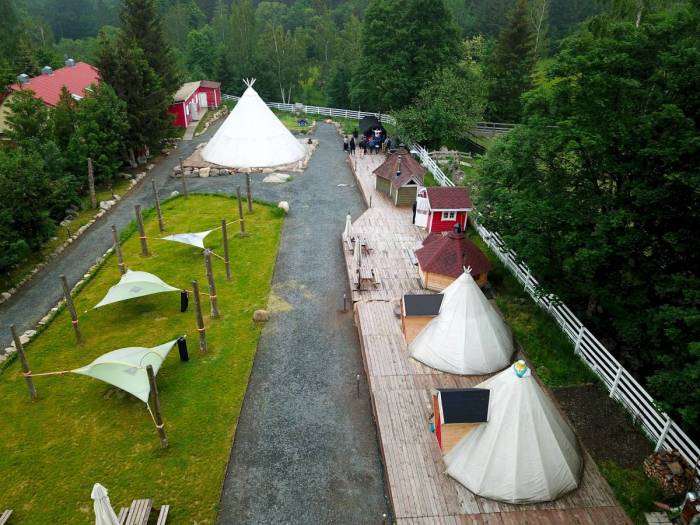 Wioskę wyróżnia nieprawdopodobna oryginalność. Tylko tutaj można w tak naturalny sposób łączyć wypoczynek ze zdobywaniem wiedzy o kulturze w nowatorski sposób. Wszystkie elementy wyposażenia wioski mogą pochwalić się swoją historię i wszystkie mają konkretne przeznaczenie. Wszystkie elementy pochodzi z Finlandii, nawet do budowy użyto wyłącznie z fińskiego drewna, a przy budowie pracowali przede wszystkim fińscy fachowcy. A już absolutnym hitem jest nocleg w wiszącym namiocie.