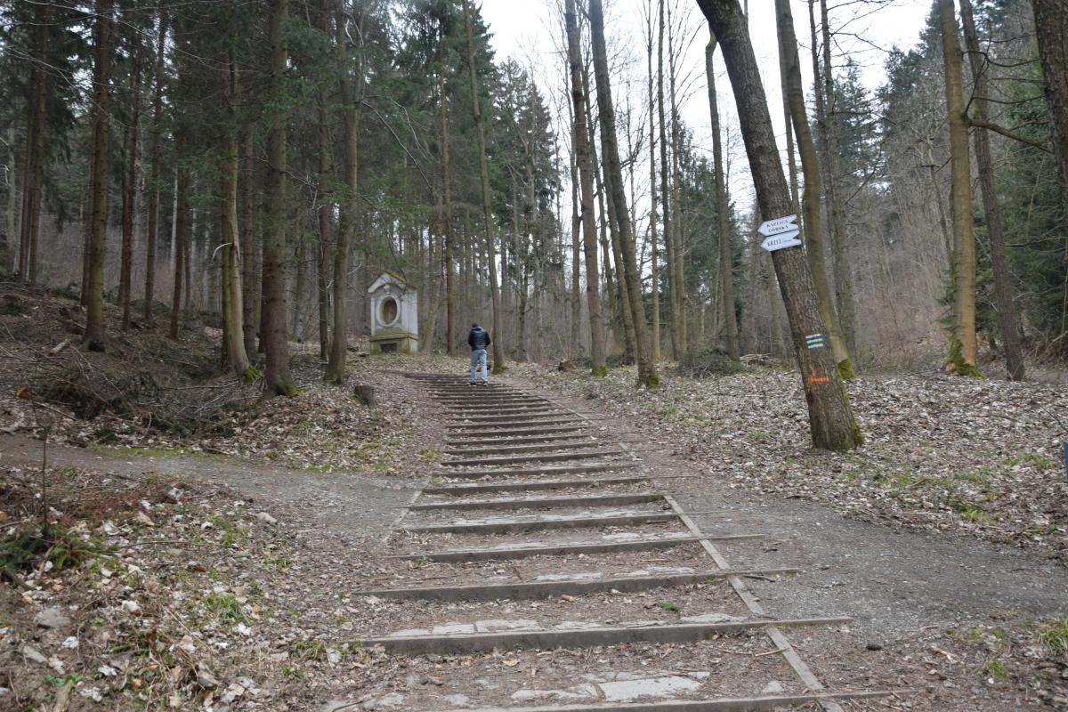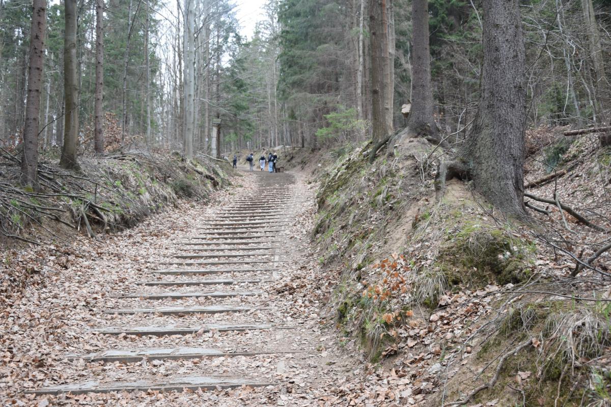 Całość ma około 1,7 kilometra długości. Niby niewiele, ale charakter terenu robi swoje – to nie jest spacer po deptaku. Stromizna, leśne podłoże, brak „ułatwień” sprawiają, że ta droga zachowała swój pierwotny sens. Nie została wygładzona pod masowego odbiorcę.