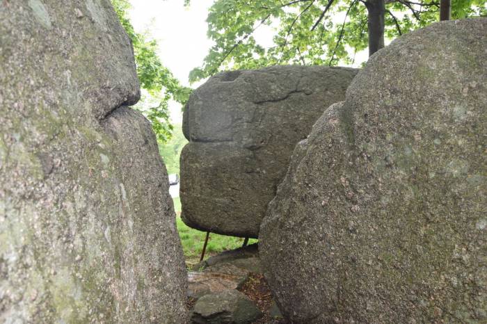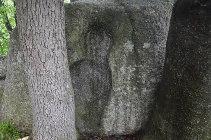 Na połączeniu kociołków dostrzegalne są nieregularne zagłębienia, w których kiedyś dopatrywano się rytu ludzkiej dłoni (wszystko jednak wskazuje, że jest to efekt działania sił natury). Obok wykuty jest znak krzyża łacińskiego. Ponieważ skała występowała w XV-wiecznych Księgach Walońskich jako ważny punkt orientacyjny, stąd ryty na skale przypisuje się tym dawnym poszukiwaczom złota i kamieni szlachetnych.
