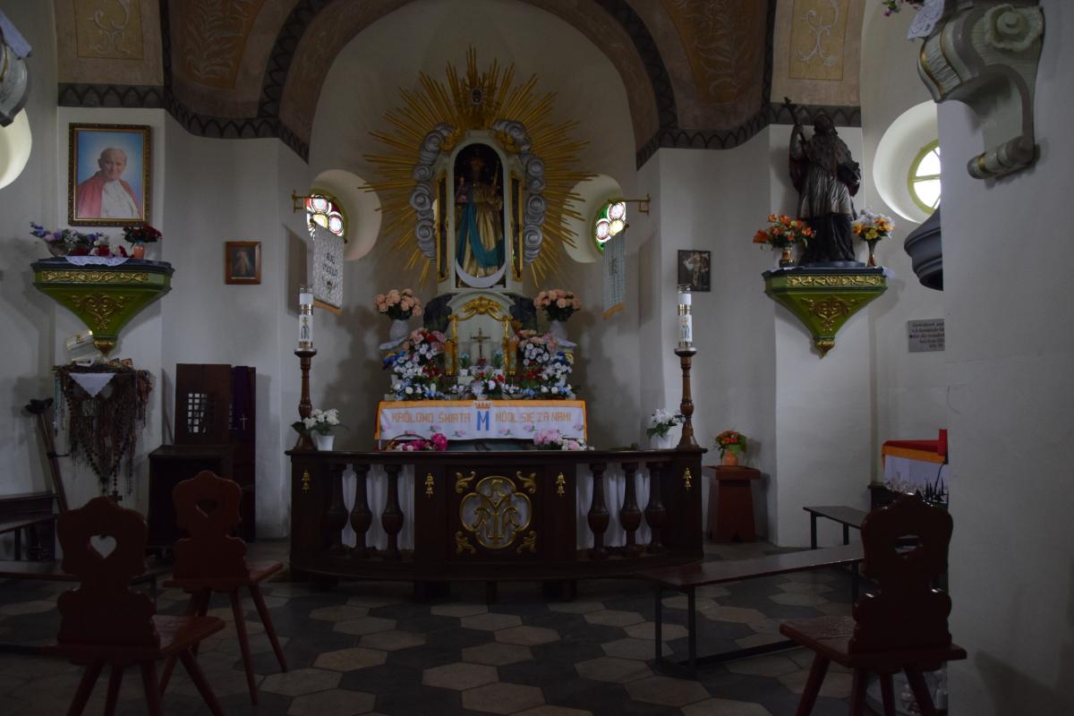 Sama budowla pozostaje skromna. Barokowa w formie, centralna w układzie, z kopułowym sklepieniem, nie konkuruje z krajobrazem, lecz wpisuje się w niego niemal bez wysiłku. W ołtarzu znajduje się przedstawienie Matki Bożej nawiązujące do lokalnej tradycji objawienia – motyw nie tyle triumfalny, co raczej kontemplacyjny, skupiony na doświadczeniu cierpienia i współczucia.
