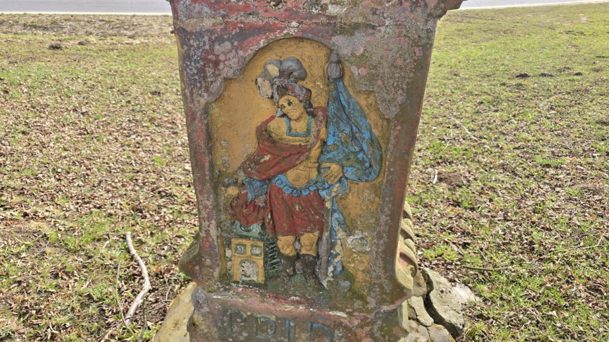 To nie jest przypadkowa kapliczka. Na pierwszy rzut oka widzimy św. Józefa z Dzieciątkiem, klasyczne przedstawienie opiekuna rodziny i patrona pracy. Ale już niżej zaczyna się coś więcej – cały program ikonograficzny. Na cokole znajdują się reliefy: Ukrzyżowanie, Pietà, scena maryjna, postać świętego. To nie dekoracja „na oko”, tylko przemyślana narracja religijna, zakodowana w formie dostępnej dla każdego, kto tędy przechodził – chłopa, wędrowca, dziecka.
