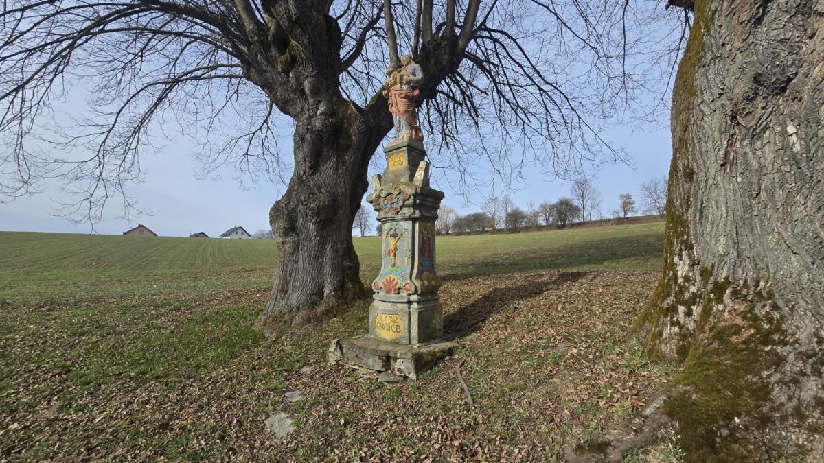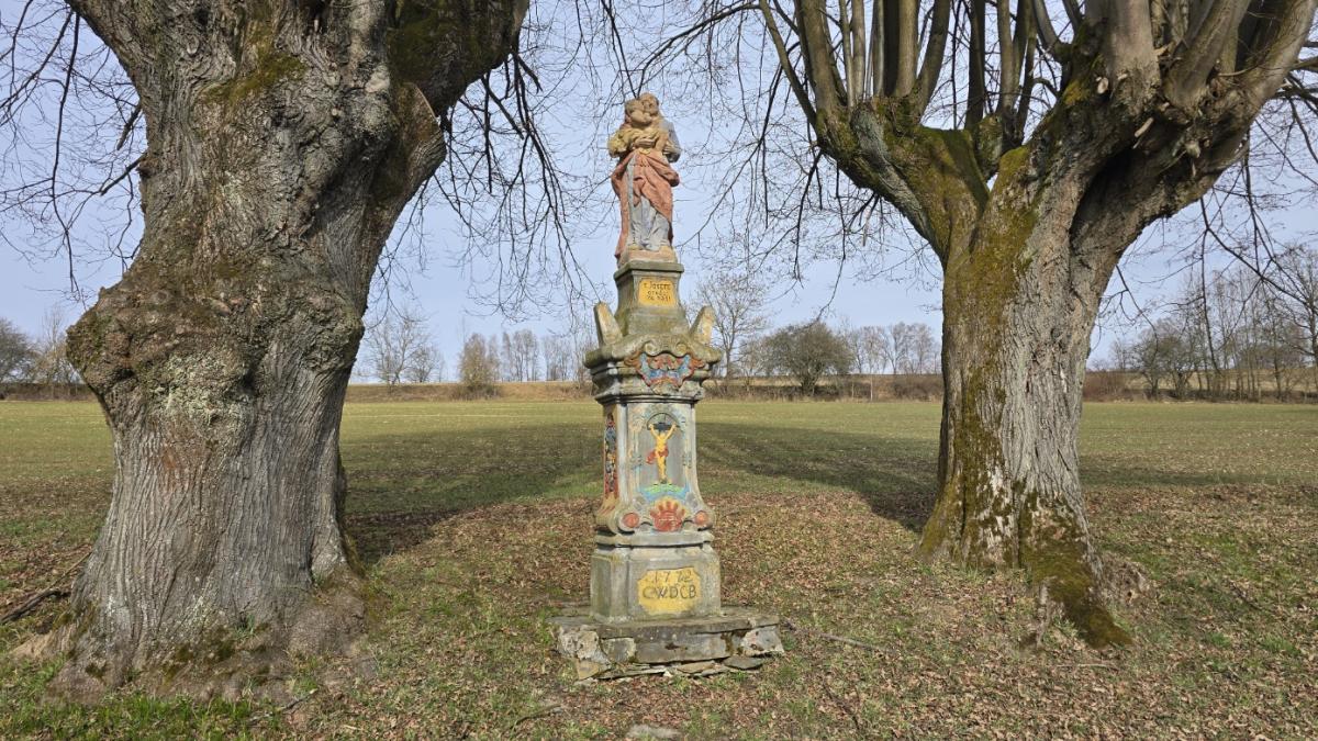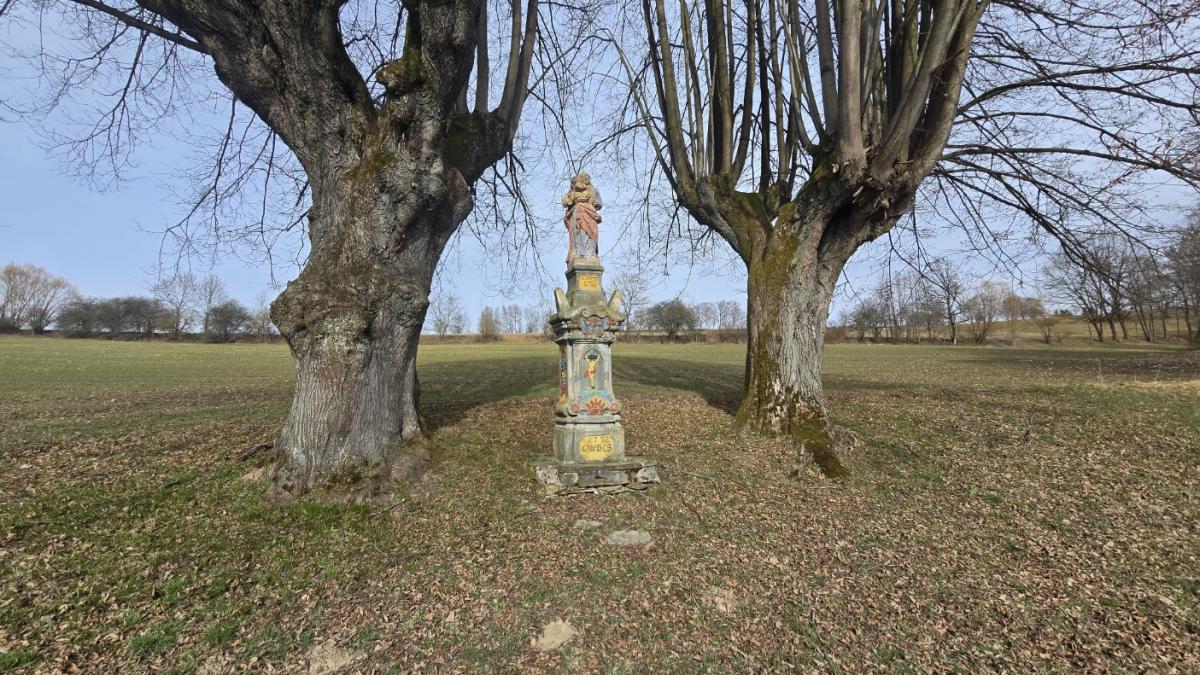 Między Jeseným a Bozkovem (znanym z jaskiń dolomitowych), na łagodnym stoku pól, stoi niepozorna, a jednocześnie zaskakująco bogata w treść figura św. Józefa. Wtopiona w krajobraz, ujęta między dwoma starymi drzewami, wygląda jak element, który „zawsze tu był”. I w pewnym sensie tak właśnie jest – choć jej historia prowadzi nas do konkretnego czasu, ludzi i warsztatu.