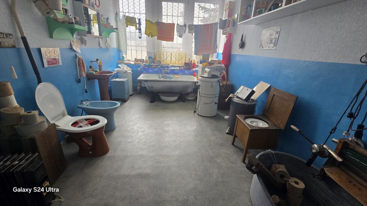 Wchodzimy do łazienki i czujemy dobrze znany zapach – mydła „Biały Jeleń” i wody brzozowej. W rogu stoi pralka Frania, gotowa, by znowu zakręcić bębnem. Na ścianie półka z fiolkami po perfumach „Być Może” i dezodorantem „Brutal” – klasyka każdego męskiego wieczoru przed zabawą. A na wannie leży plastikowa miska do mycia nóg – bo kto wtedy miał kabinę prysznicową?