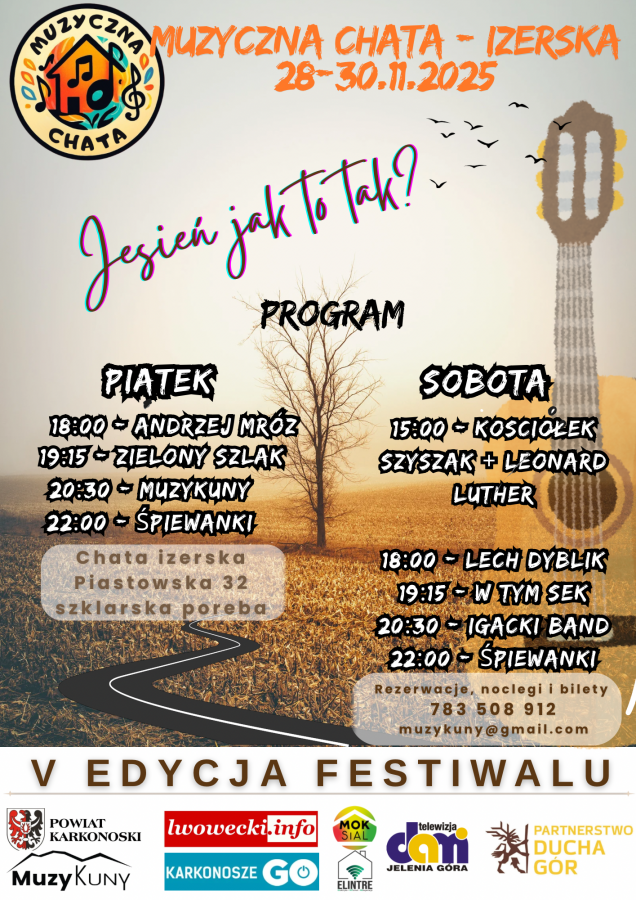 Już w dniach 28–29 listopada 2025 r. Chata Izerska w Szklarskiej Porębie Dolnej ponownie stanie się miejscem, w którym muzyka spotyka się z ciszą gór i zapachem jesieni. Podczas tegorocznej odsłony festiwalu „Muzyczna Chata Izerska – Jesień Jak to tak?” słuchacze zanurzą się w brzmieniach poezji śpiewanej, folku i piosenki drogi – gatunkach, które najlepiej smakują w kameralnym, drewnianym wnętrzu oświetlonym blaskiem lamp. Dwa kolejne wieczory wypełnią dźwięki tworzone z myślą nie o widowisku, lecz o spotkaniu: z artystą, z historią, z samym sobą. To muzyka, która nie zagłusza, tylko prowadzi. Muzyka, która nie udaje – po prostu jest.