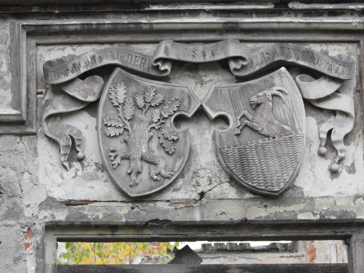 Na południowej elewacji do dziś można dostrzec resztki kamiennych kartuszy herbowych – w jednym z nich wyraźnie widoczny jest herb rodu Boninów: tarcza z ukośnym pasem i motywem gwiazdy, flankowana ozdobnym ornamentem roślinnym. Obok zachowały się fragmenty drugiego herbu, prawdopodobnie należącego do rodziny Roederów, z charakterystycznym wizerunkiem skrzydlatego gryfa. Te kamienne świadectwa, mimo uszkodzeń, nadają ruinie niepowtarzalny charakter – są niemym śladem dawnych właścicieli, którzy przez stulecia kształtowali dzieje tego miejsca.