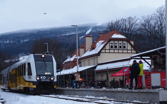 Pociąg Kolei Dolnośląskich wyruszył z Gryfowa Śląskiego, a bieg zakończył przy wyremontowanym kosztem 6 mln zł dworcu w Świeradowie-Zdroju.