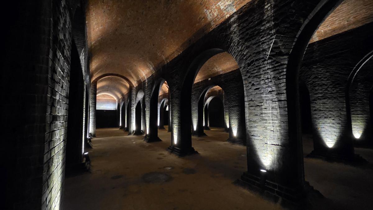W skład zespołu wchodzą trzy główne zbiorniki. Dwa starsze, ceglane, z końca XIX wieku, tworzą monumentalne przestrzenie oparte na regularnym rytmie masywnych filarów i sklepień. Trzeci, betonowy, dobudowany na początku XX wieku, jest bardziej surowy w formie, ale nie mniej imponujący skalą. Łączna pojemność wszystkich komór przekracza 30 milionów litrów wody. To liczba, która uświadamia, że nie mamy do czynienia z ciekawostką, lecz z infrastrukturą krytyczną dla funkcjonowania miasta.