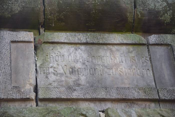 I taka inskrypcja zachowała się na jednej z płyt obelisku w Barcinku. Pozostałe wykute epitafia to: Das Vaterland darf jedes Opfer fordern (Ojczyzna może żądać każdej ofiary), Deutsche Art Gott Bewahrt (Bóg zachowa niemiecki styl), Schön und chrenhaft ist es fürs Vaterland zu sterben (To piękne jest umierać w obronie ojczyzny).