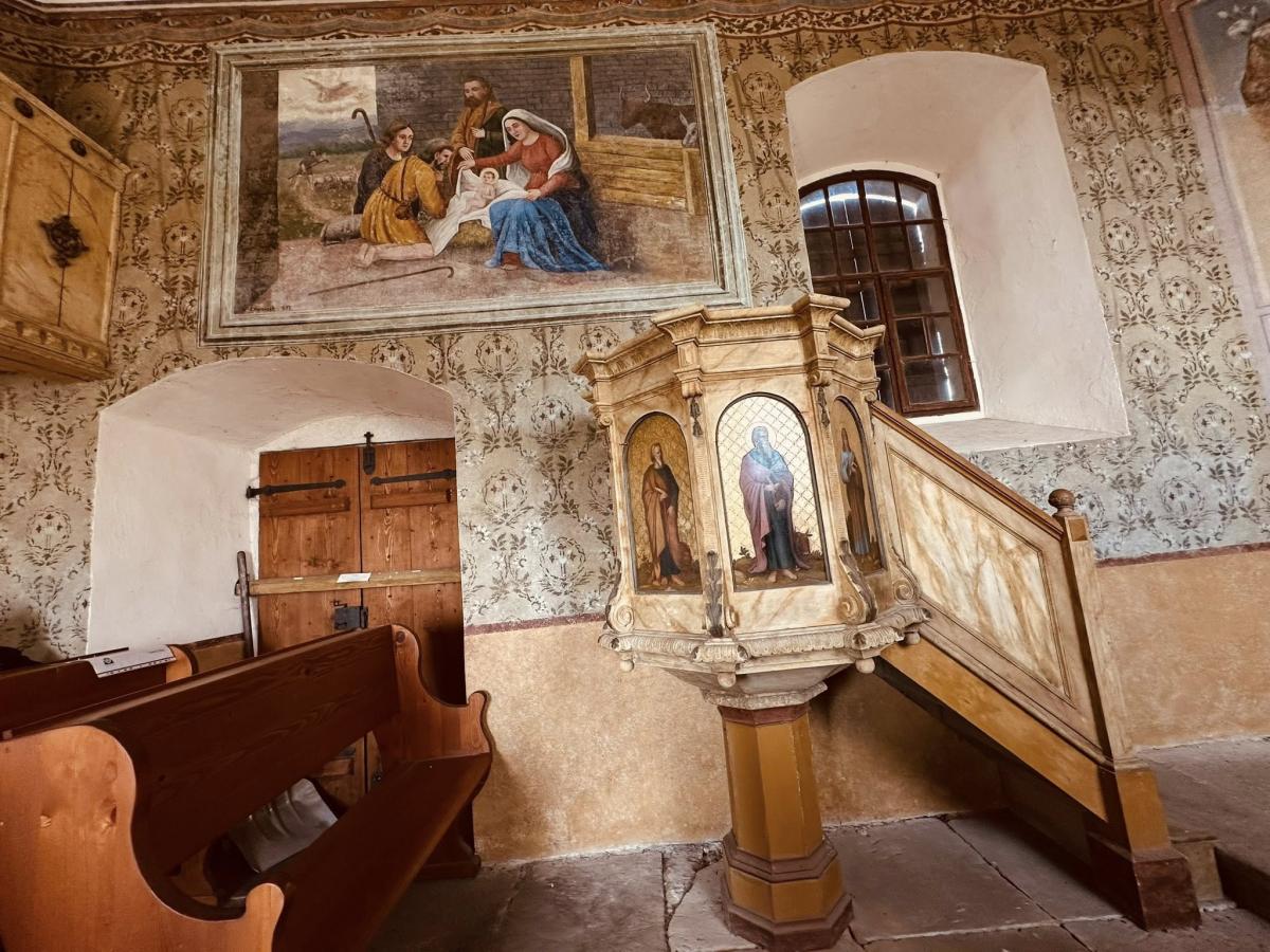 Ściany kaplicy pokrywa dekoracja malarska – subtelne ornamenty roślinne nadają wnętrzu niemal domowy charakter, jednocześnie tworząc tło dla przedstawień sakralnych. Ambona, ustawiona przy południowej ścianie, ozdobiona jest wizerunkami świętych – niczym miniaturowa galeria, z której mogło niegdyś rozbrzmiewać słowo Boże. Centralny ołtarz wieńczy obraz św. Anny uczącej małą Marię. Wokół niej, na ścianach prezbiterium, rozlokowane zostały postacie apostołów i świętych, wkomponowane w ścienne malowidła.