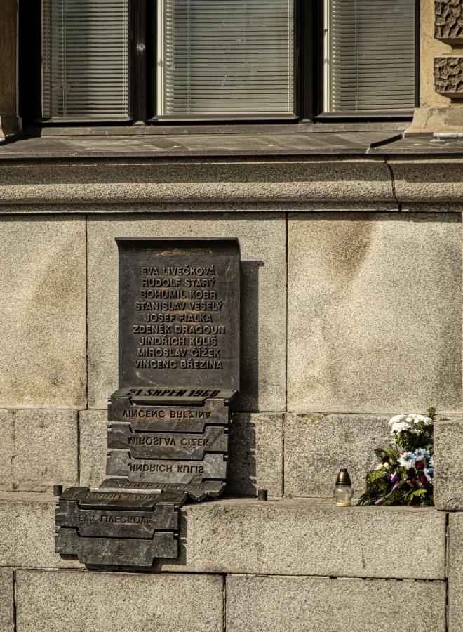 Warto zwrócić uwagę na detal, który mówi więcej niż oficjalne inskrypcje. Obok głównego wejścia znajduje się pomnik poświęcony ofiarom wydarzeń z 1968 roku, czyli interwencji wojsk Układu Warszawskiego, znanej jako Praska Wiosna. Forma – fragment gąsienicy czołgu – nie pozostawia zbyt wiele miejsca na interpretacyjną swobodę.