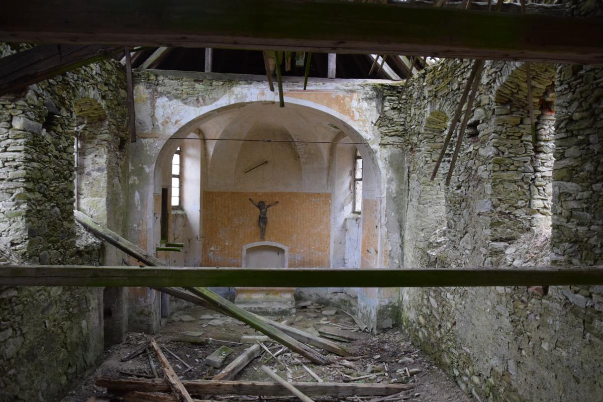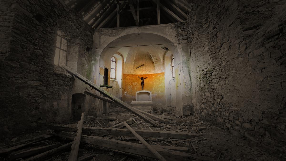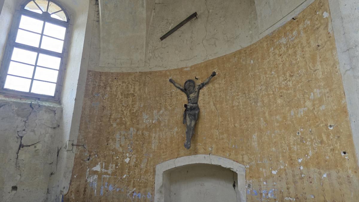 Na ścianie prezbiterium wciąż znajduje się postać Chrystusa. Bez krzyża, przytwierdzona do muru, który sam jest już na granicy rozpadu. To nie jest już element wyposażenia ani część uporządkowanej przestrzeni sakralnej. To pojedynczy znak, który pozostał w miejscu, z którego zniknęło wszystko, co kiedyś go definiowało.