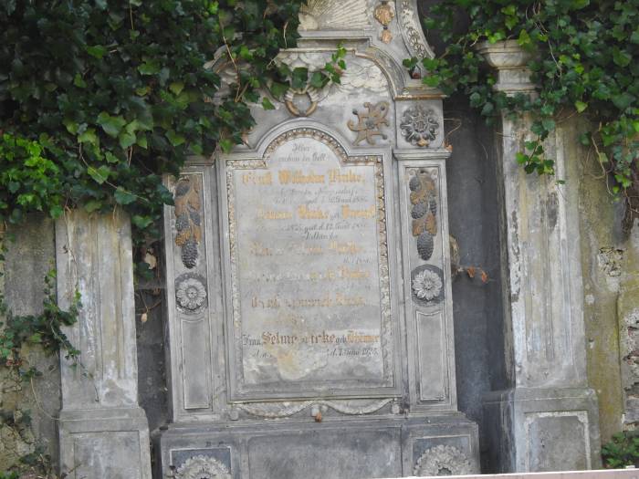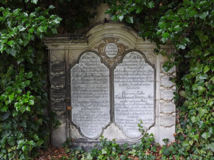 Dwupłytowy rodzinny nagrobek. Na lewej płycie: Melchior Weise, kupiec i handlowiec, urodzony 11 maja 1685 roku a zmarły 6 stycznia 1746 roku, jego żona Anna Katharina Weise zd. Krusch, urodzona 4 listopada 1691 roku a zmarła 11 stycznia 1773 roku, Christiane Friedericke zd. Frölich, urodzona 9 lipca 1780 roku a zmarła 3 lipca 1807 roku oraz Johann (nazwisko nieczytelne) urodzony 4 października 1806 roku a zmarły 30 kwietnia 1807 roku.