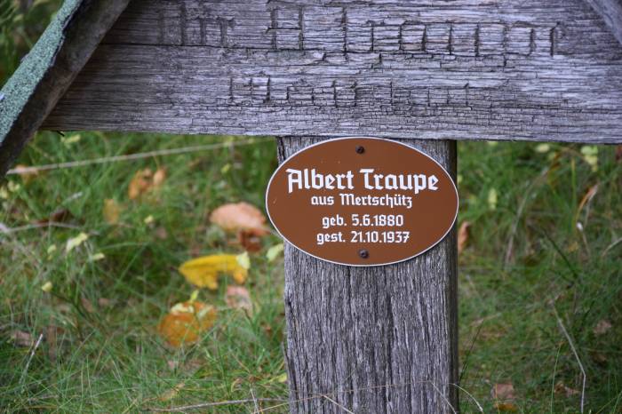Wdowa zwróciła się do zarządcy lasów należących do Schaffgotschów, o zgodę na postawienie pamiątkowego krzyża w miejscu śmierci jej męża. Otrzymała taka zgodę, jednak krzyż postawiono dopiero w maju 1941 roku. Wyryto na nim napis : Tutaj zmarł dyrektor A. Traupe z Mertschütz