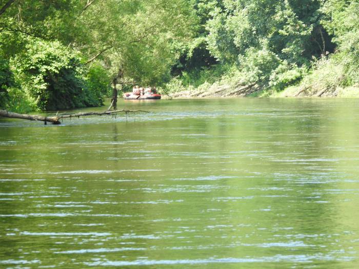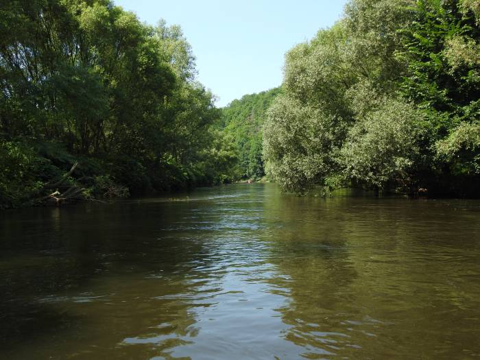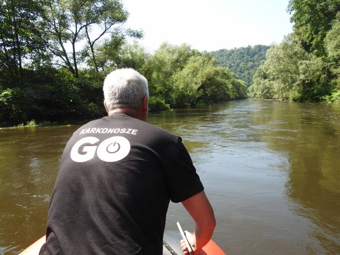 Nurt łagodnie niesie kajak w dół rzeki sprawiając, że mamy wiele czasu na podziwianie widoków. Jak okiem sięgnąć - zielono. Nad głową słoneczny błękit. W oddali zarys Karkonoszy a miejscami widać nawet Śnieżkę. Rzeka jest bardzo spokojna i malownicza. Płynąc pontonem trzeba trochę powiosłować. Nie ma tu jednak wodospadów, niebezpiecznych kamieni, czy rwących nurtów.