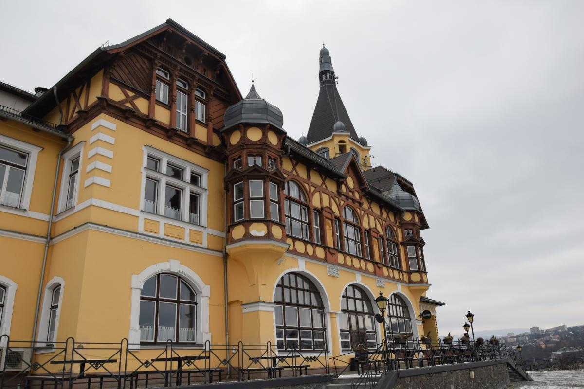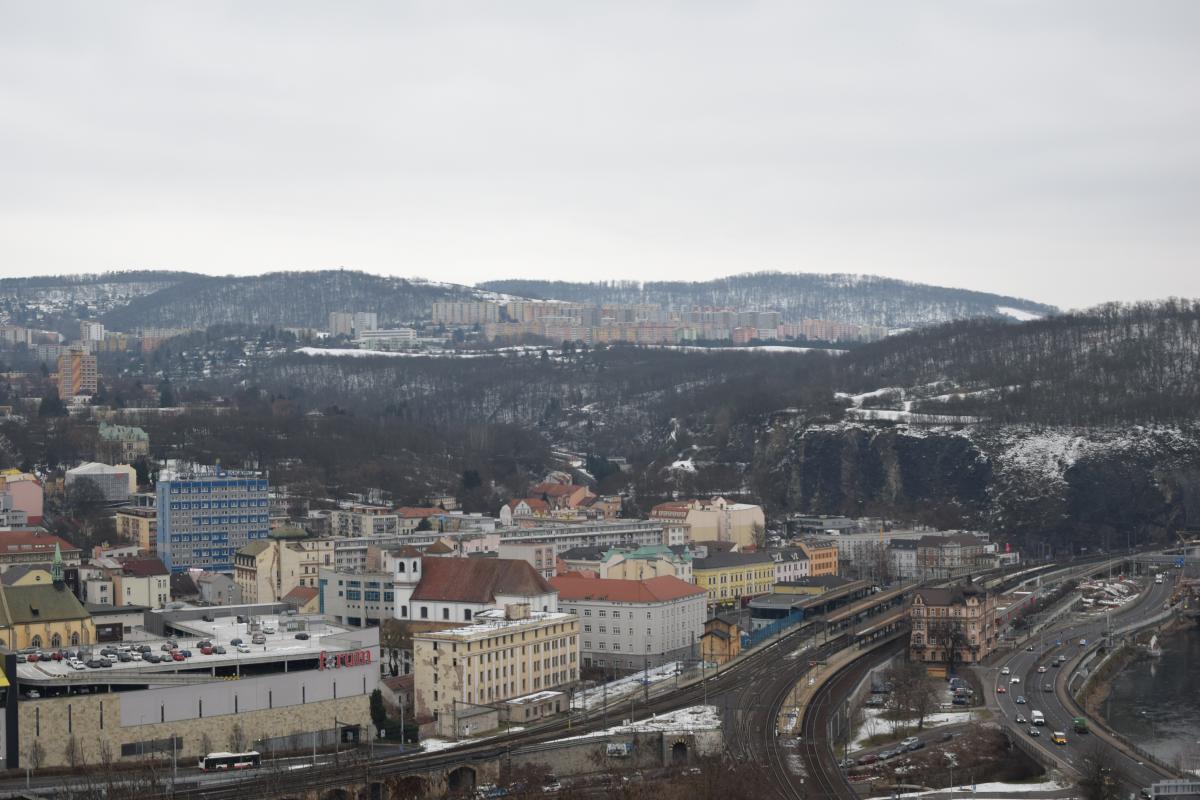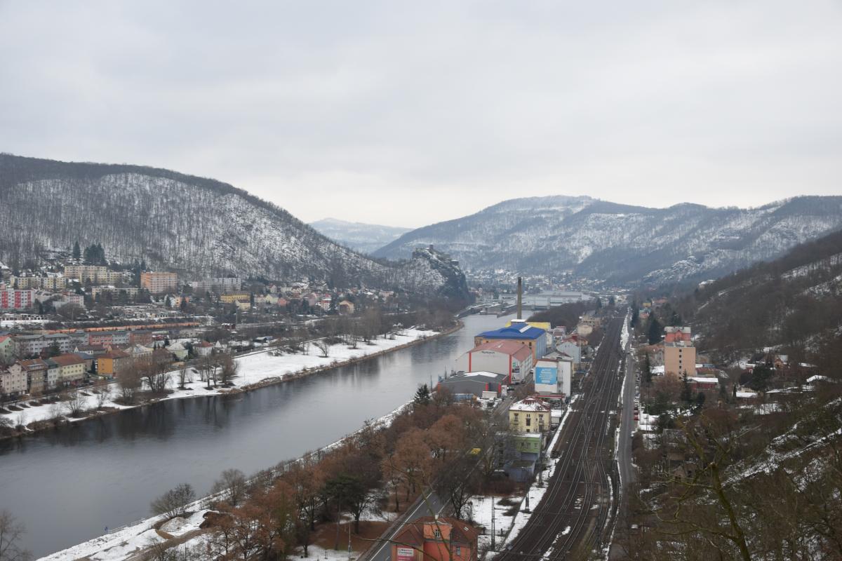 Sam obiekt powstał pod koniec XIX wieku jako restauracja z wieżą widokową i od początku miał jeden cel: pokazać krajobraz. I robi to do dziś. Z tarasów i z około trzydziestometrowej wieży widać układ miasta wpisanego w dolinę Łaby, przemysłową historię regionu i surowe piękno północnych Czech. W pogodne dni widoczność sięga naprawdę daleko, a rzeka, wijąca się między zboczami, wygląda jak element scenografii, a nie infrastruktury transportowej.