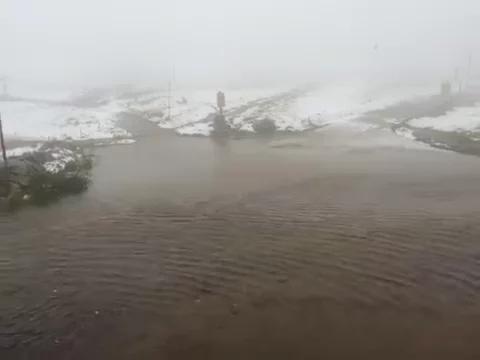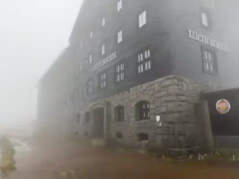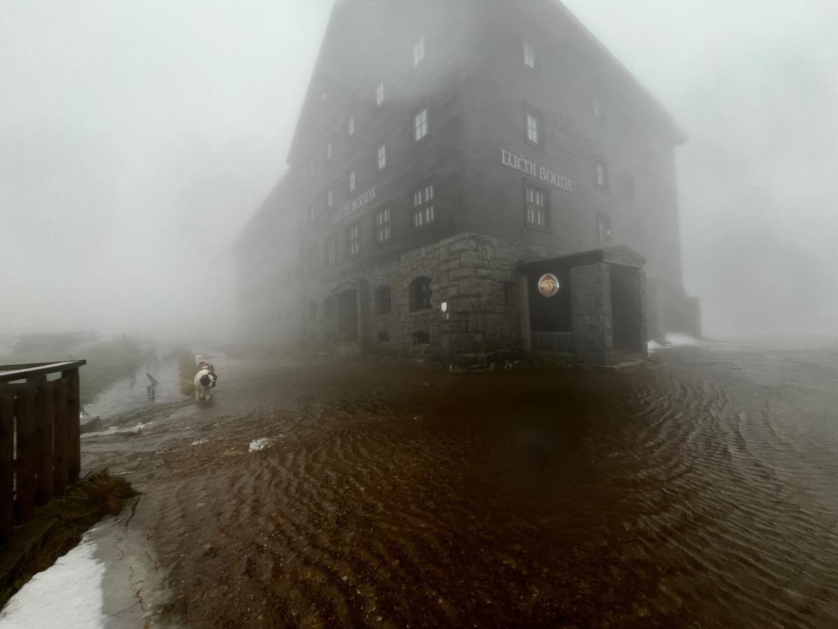 Górski hotel Luční bouda na tle deszczu, topniejącego śniegu i wody z Białej Łaby. Właściciele uważają, że opady deszczu nie stanowią tu zagrożenia, dzięki stacji meteorologicznej monitorującej ilość wody. Pierwszy śnieg zwiastuje zbliżającą się zimę, a opady deszczu powodują powstanie stawu obok schroniska. Mimo ekstremalnej pogody górale pozostają zaskoczeni widokiem. W Karkonoszach nadal spodziewane są intensywne opady deszczu.