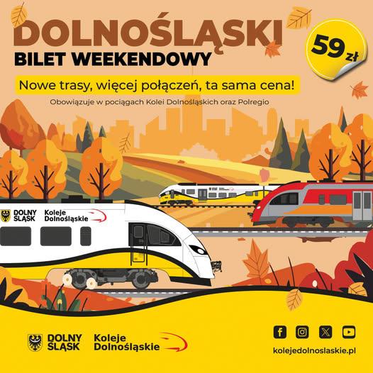 Przeżyj niezapomnianą podróż z Kolejami Dolnośląskimi dzięki „Dolnośląskiemu Biletowi Weekendowemu”. Za 59 zł możesz podróżować od piątku do poniedziałku pociągami KD i POLREGIO. Zwiedzaj Dolny Śląsk od Szklarskiej Poręby po Kotlinę Kłodzką czy spaceruj po urokliwym Wrocławiu. Oszczędzaj, ciesz się wolnością bez ograniczeń i podróżuj komfortowo w klimatyzowanych pociągach z miejscem na rowery. Jesień to idealna pora na odkrycie regionu, dlatego zaplanuj wyprawę już dziś! Szczegóły na kolejedolnoslaskie.pl.